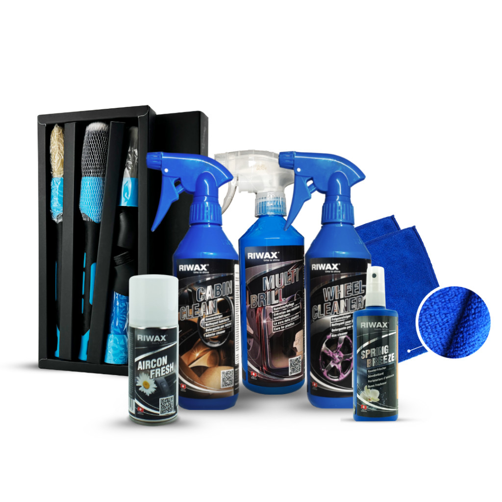 A csomag minden darabja a Riwax prémium minőségét képviseli. A Cabin Clean belsőtér tisztító hatékonyan eltávolítja a makacs szennyeződéseket az ülésekről és műanyag felületekről, a Multi Brill visszaadja a műanyagok természetes fényét. Az Aircon Fresh fertőtleníti és felfrissíti a szellőzőrendszert, így az utastér levegője tiszta és egészséges marad. A Spring Breeze légfrissítő kellemes illatot biztosít, míg a Wheel Cleaner az autó külsejének tisztaságát teszi teljessé.